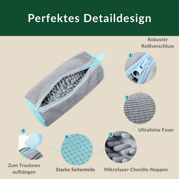 Die flauschigen Chenille-Noppen im Inneren sorgen für sanfte Reinigung, reduzieren Reibung und fangen Haare, Staub und Sand zuverlässig ab.